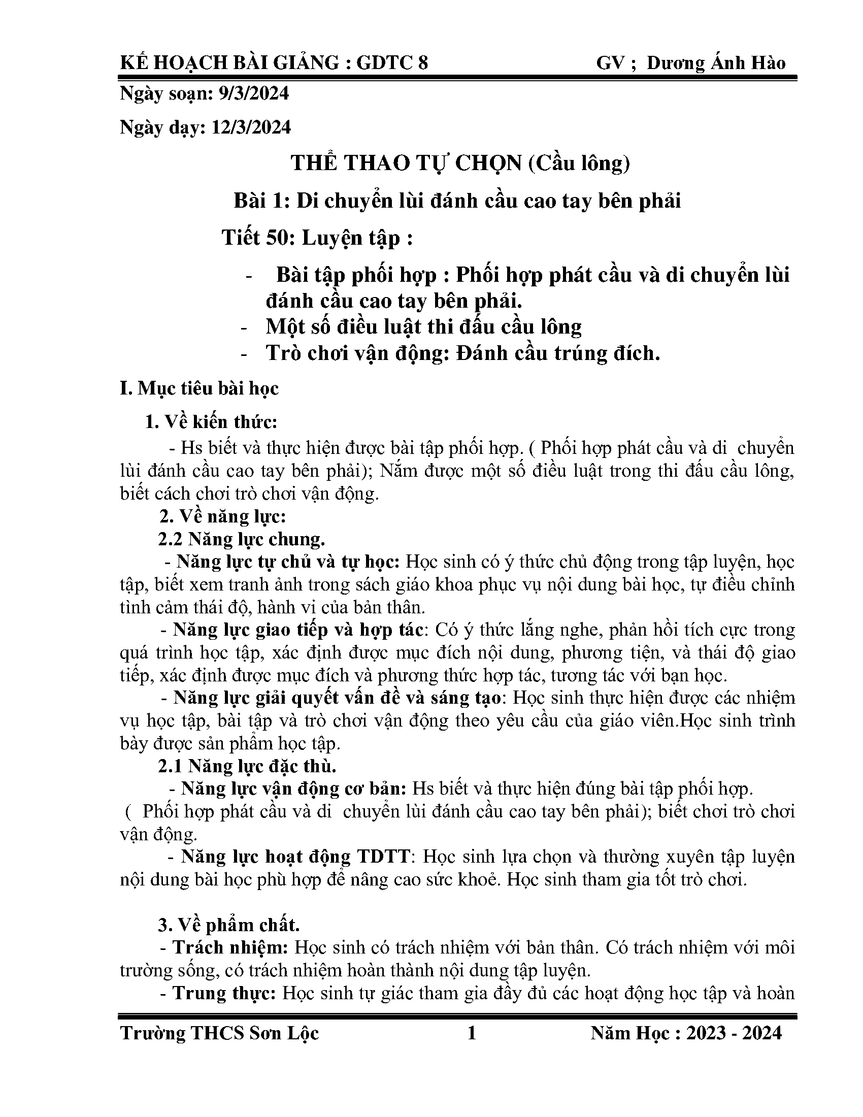Bài 1: Di chuyển lùi đánh cầu cao tay bên phải